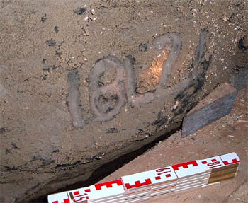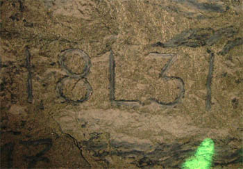 Im Jahr 1831 hat man den Winkel unter der Jahreszahl eingeschlagen. In einem Bohrloch in der Ecke des Winkels steckt noch ein Holzpflock für die Schnur des Markscheiders. |