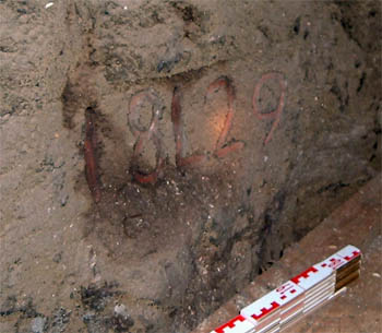 Auch die Tafel aus dem Jahr 1826 ist nur schwer zu erkennen, auch hier der Winkel zwischen den Ziffern. |