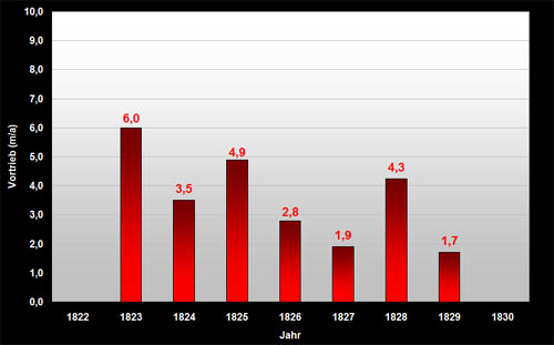 auf einen Vortrieb von 6,1 m pro Jahr oder rund 2 cm pro