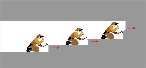 Analog ging man auch beim Verbreitern des Profils vor: Der "Schnellvortrieb" erfolgte nur mit minimalem Querschnitt, hinter dem Ort arbeiteten wieder mehrere Hauer hintereinander daran, das Streckenprofil zu erweitern. |
