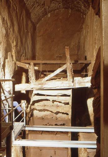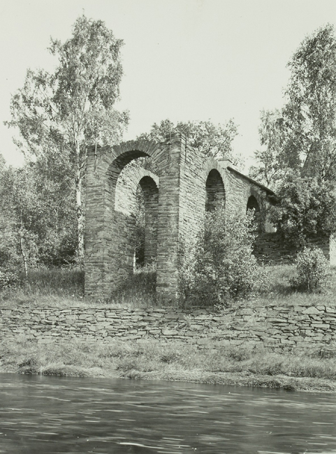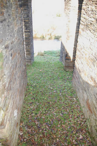 ![]() Eine erhaltene Radstube der einst zwei nebeneinander liegenden. Das im Bild sichtbare eiserne, oberschlächtige Rad mit einer Leistung von 50 PS wurde um 1850 hier eingebaut. |