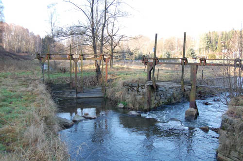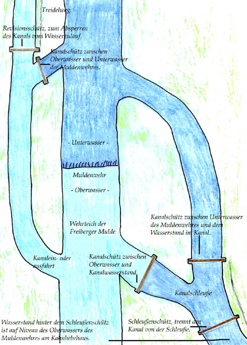 ![]() Unmittelbar unterhalb des Schleusenwehres lag linksseitig der Mulde der erste Wasserabschlag des Erzkanals. Damit war es - z.B. auch bei Wartungsarbeiten - möglich, die aus dem Wehrteich zusetzenden Wasser wieder in die Mulde zu leiten und den Kanal ganz trockenzulegen. |