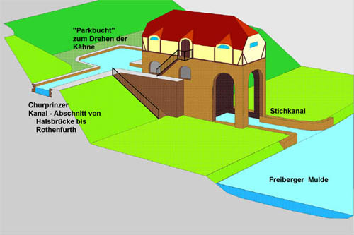 Das 1788 bis 1789 vom Kunstmeister J. F. Mende errichtete Kahnhebehaus zwischen dem oberen Teil der Churprinzer Bergwerkskanäle von Halsbrücke nach Rothenfurth und der Querung des Münzbachtals rechtsseitig der Mulde zum unteren Teil der Churprinzer Kanäle war das erste Schiffshebewerk der Welt. Zugegeben - gerade sehr groß erscheinen die noch erhalten gebliebenen Fundamente heute nicht mehr. Aber immerhin konnten hier - etwa in der Mitte des insgesamt 5,3 km langen Wasserweges - die 7,75 m langen, 1,35 m breiten, hölzernen und mit immerhin 2,5 Tonnen Erz beladenen Kähne aus einem Stichkanal von der Freiberger Mulde um 6,8 m hinauf in den Oberen Churprinzer Kanal befördert werden. Oder leer andersherum. Das Heben der Kähne erfolgte über einen fünffachen Flaschenzug, der seinerseits an einer Laufkatze befestigt war. Nachdem man den Kahn eingehängt und reichlich 7 m hinauf gezurrt hatte, schob man die Laufkatze einmal längs durch das Gebäude und senkte den Kahn dann im Oberen Kanalabschnitt wieder ab. Hier hatte man eine Art "Parkbucht" angelegt, um die sperrigen Kähne drehen und in den weiteren Kanalverlauf "einfädeln" zu können oder auch um zwischendurch die leeren Kähne - gesichert bei Muldehochwasser - "abstellen" zu können. Wie das Rothenfurther Kahnhebehaus ausgesehen und funktioniert hat, zeigen Ihnen unsere zwei kleinen Raumbilder. Ein weiteres Kahnhebehaus