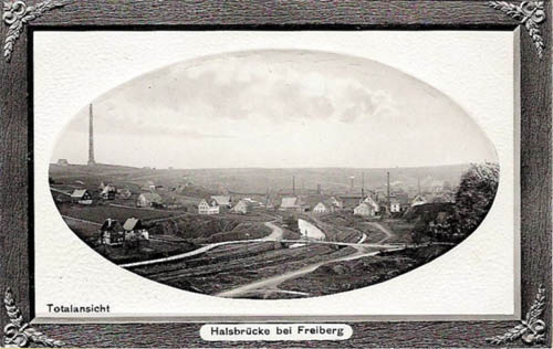 ![]() Auf dieser Postkarte aus den 1920er Jahren ist der ehemalige schiffbare Erzkanal neben der Freiberger Mulde noch gut zu erkennen. Rechts neben der Brücke befindet sich der Durchlaß für den Kanal. Auch ist der Verlauf bis in das Hüttengelände noch zu sehen. |