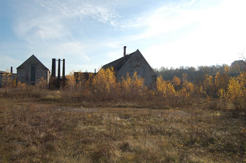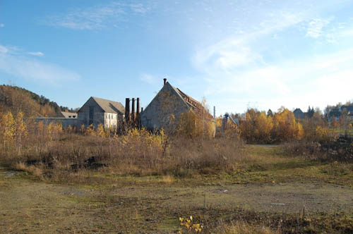 ![]() Ansicht des Werksgeländes von der KAP-Straße aus. Noch heute ist auch der gekürzte Schornstein weithin sichtbar. |