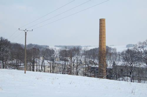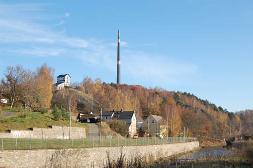 ![]() Das Werksgelände des Pappenwerkes war weithin sichtbar durch einen 70 m hohen Schornstein markiert. Wegen Baufälligkeit wurde dieser so weit abgetragen, wie der Bauschutt in die Esse paßte. Der Kanal verläuft von hier aus ohne weitere Kurve bis in die Erzverladestation im untertägigen Kanal. |