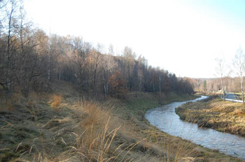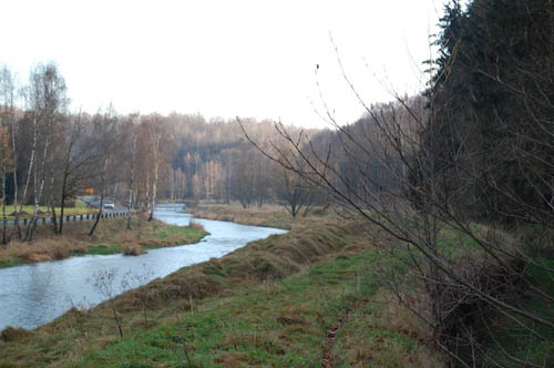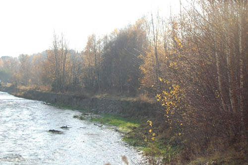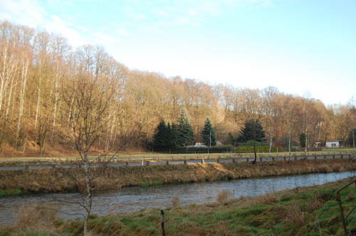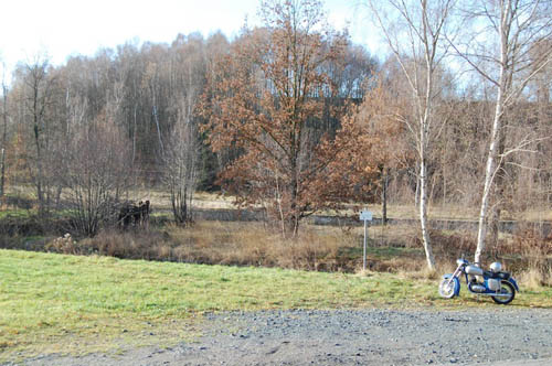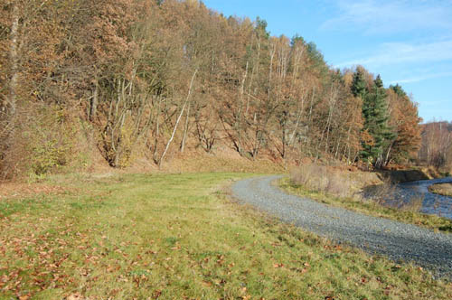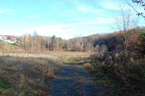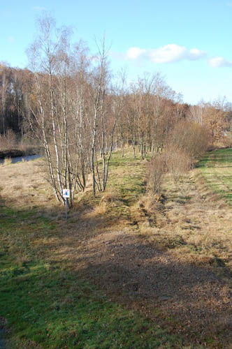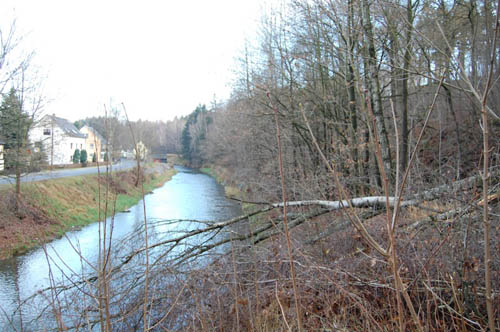 ![]() Der Kanaldamm auf dem linken Ufer der Mulde ist von der Talstraße aus kaum erkennbar, man muss wissen, wo der Kanal verläuft. |
