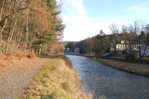 ![]() Der Kanalverlauf im Grubengelände von „Churprinz Friedrich August Erbstolln“, wie das Berggebäude eigentlich richtig heißt. Neben der Brücke wurden die Versorgungsleitungen des Ortes über den Kanal verlegt. |