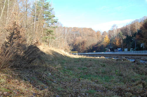 ![]() Stellenweise ist die Kanaldammmauer aber auch als markanter bewachsener Streifen von der Talstraße gut sichtbar. |