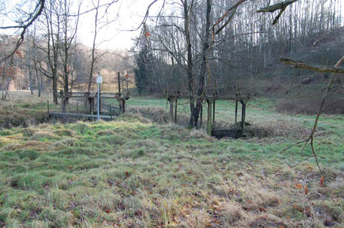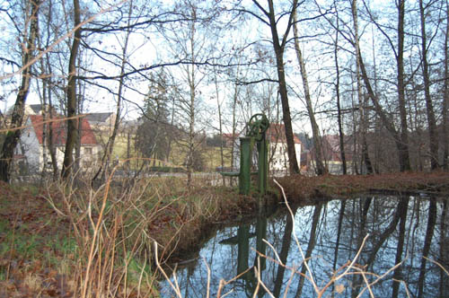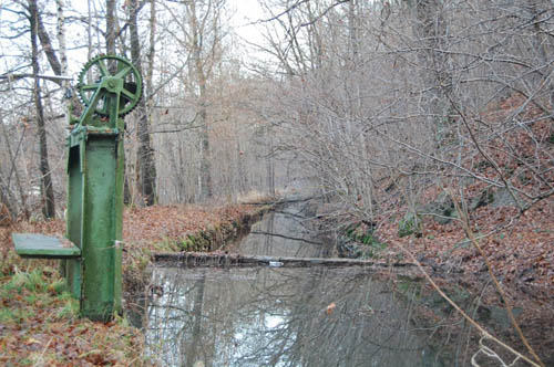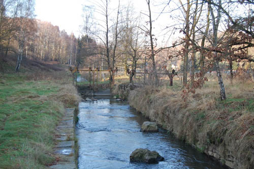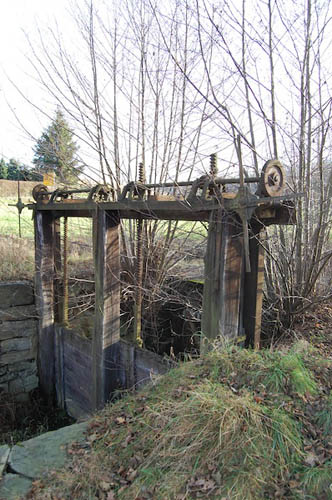 ![]() Die im Bild sichtbaren Schütze kündigen den Wasserabschlag und die Fortsetzung des Kanals zur Grube „Kurprinz“ an. |