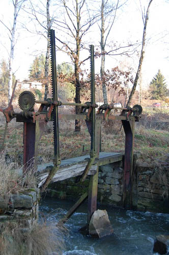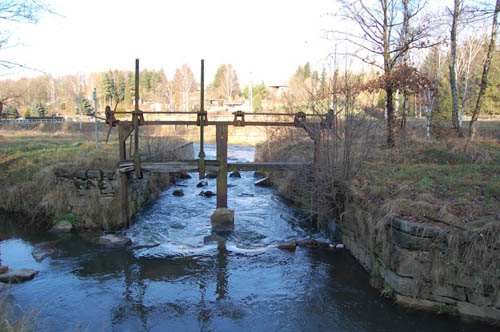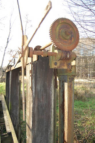 ![]() Das Ständerwerk des Schützen stammt aus neueren Zeiten, als der Kanal als Brauchwasserzuleitung für die Pappenfabrik genutzt wurde. Die im Kanal eingebrachten „Spülsteine“ sollen den Sauerstoffgehalt des Wassers verbessern. |