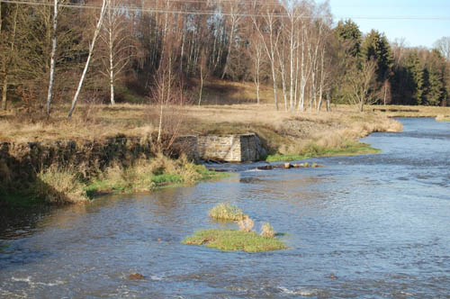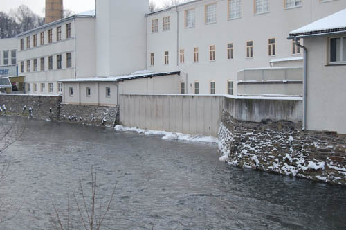 ![]() Die nach dem Hochwasser 2002 mit Betonelementen verschlossene, breite Öffnung in der Ufermauer war der Wasserabschlag des Kanals, als man das Wasser noch zur Energiegewinnung nutzte. |