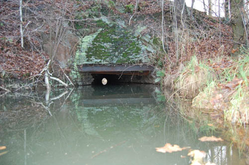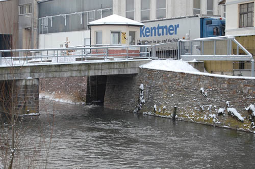![]() Wasserabschlag aus der letzten Nutzungsperiode. Auch hier wird es früher einmal eine Bruchsteingewölbebrücke für den Treidlerweg gegeben haben. Bis in die 1960er Jahre wurde dieser Kanalteil von der Pappenfabrik noch genutzt. Das Wasser wurde in der Pappenherstellung und für Reinigungszwecke benutzt. |