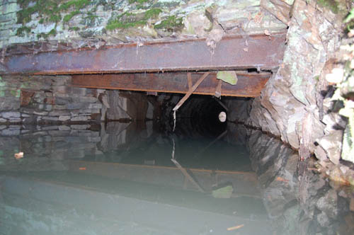 ![]() Durchblick, es ist immer Licht am anderen Ende. Der im Mundlochbereich befindliche Verbau ist äußerst desolat und mit der Gewichtslast der aufgeschlichtenen Bruchsteinmauer überfordert. Einer der Stahlträger knickt schon ab ! |