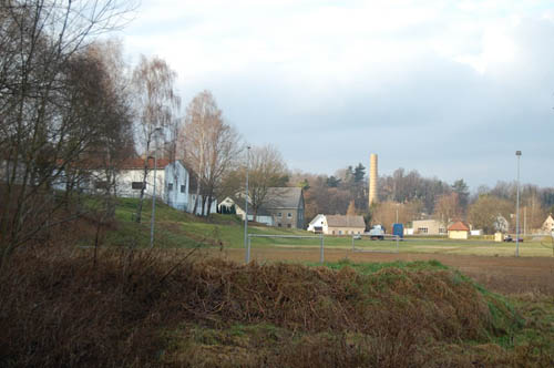 ![]() Im Vordergrund ist der ehemalige Sportplatz von Großschirma zu sehen und im Hintergrund, erkennbar am Schornstein, die Pappenfabrik. Etwas oberhalb vom Sportplatz am Hang verlief der vom Kanal abzweigende Mühlgraben der Großschirmaer Mühle. |