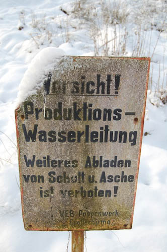 ![]() Ein Schild aus Zeiten der letzten Kanalnutzung ! Das Pappenwerk benutzte das Wasser des Waltersbachs und des Zechenteichs anfangs direkt über den Erzkanal zur Herstellung der Bierdeckelpappe. Später wurde eine Wasserleitung vom Zechenteich zum Werk gebaut die teilweise direkt im Kanal verlegt wurde. |