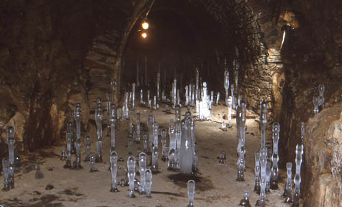 ![]() Blick in den untertägigen Teil des Kanals im Winter 1998/99. An dieser Stelle konnten die Kähne über Rollen aus den Pochgebäuden mit Erz befüllt werden. Der weitere Kanalverlauf diente als Zufluss für die Kunsträder. |