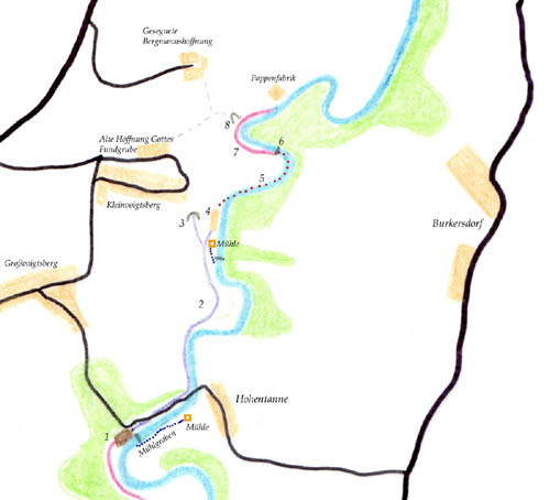 Versuche zur Projektumsetzung Vorgesehen war wieder der Ausbau des bestehenden Kunstgrabens zum schiffbaren Erzkanal. Der Kunstgraben der Grube „Alte Hoffnung Gottes“ zu Kleinvoigtsberg nahm seinen Anfang am Wehr der Hohentanner Mühle bei Großvoigtsberg. Das teilweise hölzerne Wehr speiste zum einen den Aufschlagwassergraben der Mühle von Hohentanne auf dem rechten Ufer der Freiberger Mulde und den Kunstgraben der Grube auf dem linken Flussufer. Bis zur „AHG“ hätte die Ausbaulänge 3 km betragen und wieder clevere Lösungen von den damaligen Technikern erfordert. Um die „AHG“ weiter mit Aufschlagwasser zu versorgen, sollte der Erzkanal 1600 m unterhalb des Mühlenwehres geteilt werden. Zum einen lieferte der Kunstgraben direkt das Wasser zu den Rädern im Schacht. Der Kanal sollte aber immer der Mulde folgend direkt bis zur Wäsche der „AHG“ führen. Die Mühle und Erzwäsche von Kleinvoigtsberg besaßen ebenfalls ein gemeinsames Wehr und einen dazugehörigen, 600 m langen Graben. Dieser sollte zum Kanal erweitert werden und Mühle nebst Wäsche über einen Stichgraben mit Aufschlagwasser versorgen. Nach der Erzwäsche der „AHG“ sollte der Kanal über zwei Schleusen auf die Mulde hinabgeführt werden und vermutlich über den Wehrteich der Grube „Gesegnete Bergmannshoffnung“ und einen dort abzweigenden Kunstgraben zum schiffbaren Kanal erweitert und bis zur Grube selbst führen. Von diesem ganzen Projekt sind nur wenige Teile umgesetzt worden. Im Bereich der Kleinvoigtsberger Wäsche wurden einige Kanalstücke fertig gestellt, sind aber heute nicht mehr sichtbar. Hier verlief der Kanal auf einem 2 – 3 m breiten und bis zu 2,7 m hohen Damm. Vermutlich wurde das