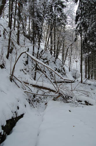 Mit Bruchholz verstopfter Graben, dafür ist der Weg begehbar. |