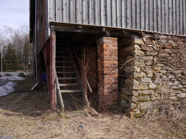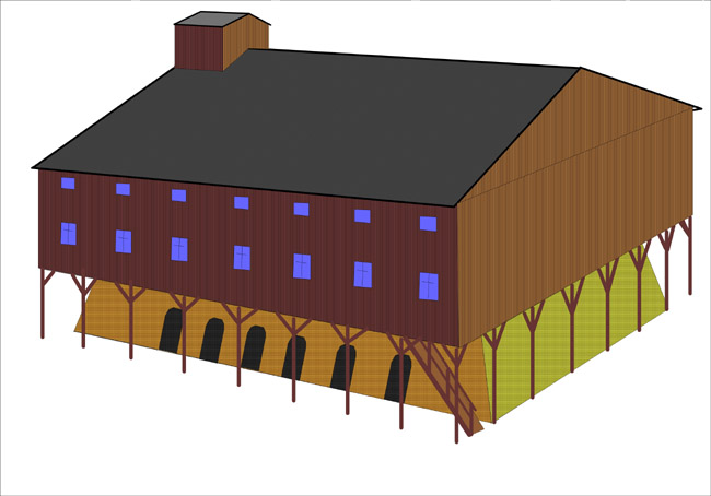 ![]() Noch eine letzte Zeichnung: Der Bauzustand des Ofenbauwerkes nach 1954. Den Zugang zum Schüttboden bildete eine Treppe an der Nordwestecke des früheren Brennofens. In dem Türmchen auf dem Ostgiebel war vermutlich ein Elevator untergebracht, mit dem man das Getreide auf den Schüttboden befördert hat.