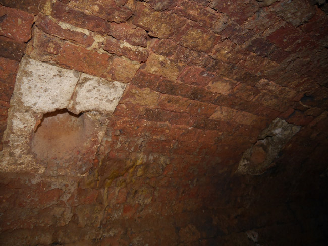 ![]() Trockenboden auf der Schürebene mit den Schüröffnungen zur Feuerung des Ringofens, Pfännerschaft Halle. Solche hölzernen Hebezüge auf den Rauchglocken, wie hier am rechten Bildrand, haben wir bei unserem Besuch in ![]() Link zur Originaldatei: http://www.deutschefotothek.de/documents/obj/87114452