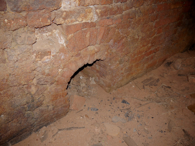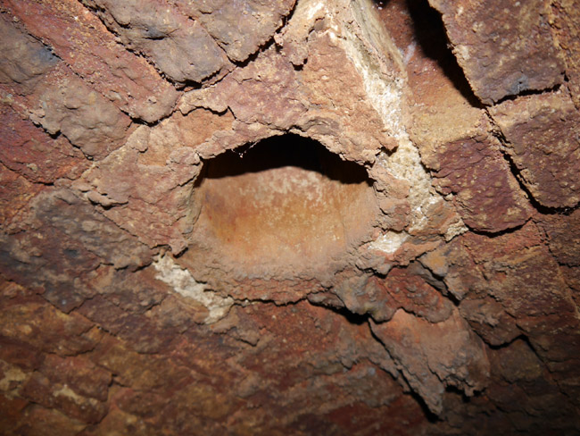 ![]() Der eigentliche Brennofen hat etwa so ausgesehen. In der Mitte der Shürebene lagen die Öffnungen für die Bedienung der Rauchglocken, außen lagen die Schüröffnungen über dem Brennkanal.
