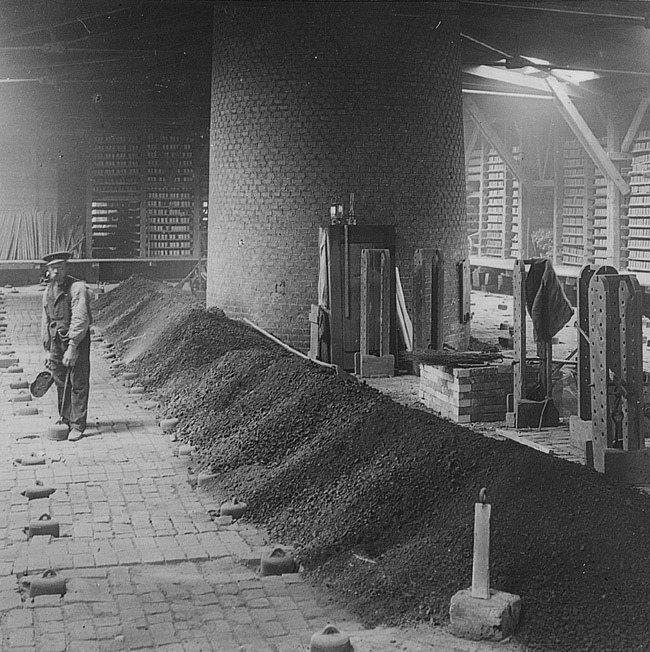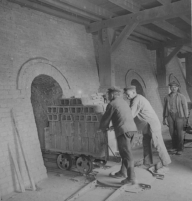 ![]() Einsetzen der Formlinge in den Ringofen, Pfännerschaft Halle, Foto: Stoedtner, Franz (Lichtbildverlag), 1900/1940 Link zur Originaldatei: http://www.deutschefotothek.de/documents/obj/87114456