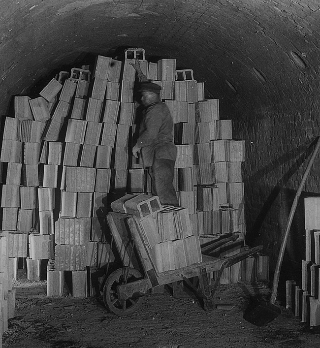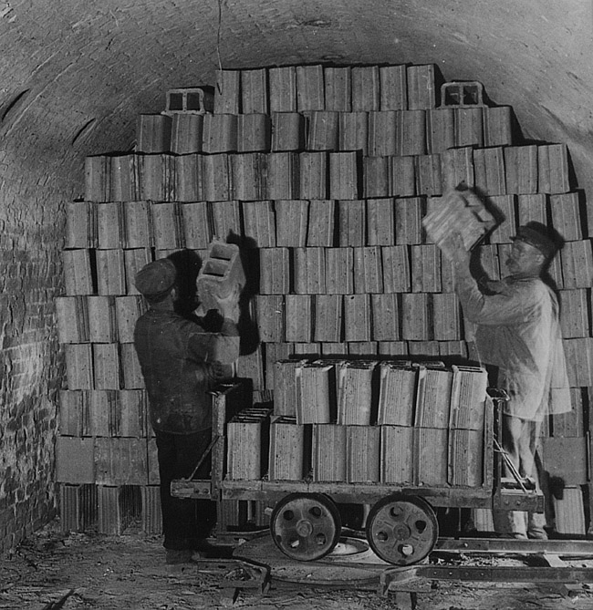 ![]() Auskarren der gebrannten Steine aus dem Ofen, Pfännerschaft Halle, Foto: Stoedtner, Franz (Lichtbildverlag), 1900/1940 Link zur Originaldatei: http://www.deutschefotothek.de/documents/obj/87114458