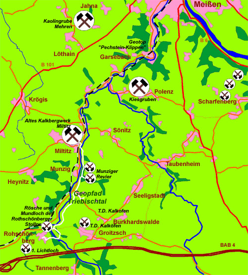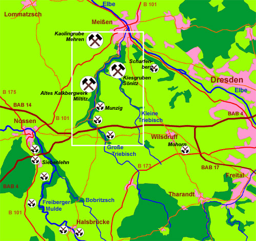 Das Triebischtal erreicht man am besten von Meißen aus oder über die zwischen Nossen und Meißen parallel verlaufende Bundesstraße B 101. In Rothschönberg am Schloß, an der Dammühle unter der Autobahnbrücke zwischen Tannenberg und Groitzsch oder am Kalkbergwerk in Miltitz gibt es Parkplätze, von denen ausgehend man sich das Gebiet erwandern kann. Es sei noch darauf hingewiesen, daß im unteren Triebischtal auch die "Garsebacher Pechstein-Klippen" als Naturdenkmal und Geotop einen Besuch wert sind. Aktiven Bergbau auf Steine- Erden- Rohstoffe gibt es in der Region auch noch: Zwischen Sönitz und Polenz gibt es mehrere Kiesgruben, in denen pleistozäne Sedimente für die Bauindustrie abgebaut werden. Bei Dobritz kurz vor Meißen wurde noch bis vor kurzem Porphyrtuff gebrochen und im Tännichtgrund bei Rothschönberg Phyllit abgebaut. Und vor den Toren der Porzellanstadt Meißen liegt - wie passend - zwischen Löthain und Jahna die Kaolingrube Mehren. |