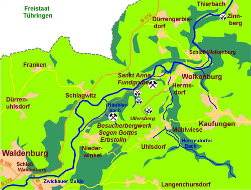 Wolkenburg liegt nördlich von Hohenstein-Ernstthal nahe der sächsisch- thüringischen Landesgrenze. Man erreicht den Ort von der BAB 4, Ausfahrt Glauchau-Ost und die B 175, Ausfahrt Hohenstein-Ernstthal und die B 180 oder die Ausfahrt Limbach-Oberfrohna; von der in Bau befindlichen BAB 72 aus über die Ausfahrt Niederfrohna. Die AG Altbergbau & Geologie Westsachsen e.V. betreut zwei Besucherbergwerke: Regulärer Besucherbetrieb findet an den Öffnungstagen in der St. Anna- Fundgrube zu Wolkenburg statt, die man im Ortsteil Herrnsdorf südlich der Zwickauer Mulde in Verlängerung der Straße Zur Papierfabrik findet. Der Segen Gottes Erbstolln befindet sich etwa 1 km nordöstlich von Niederwinkel im Tal des Häublerbaches. Er wird aber nur noch auf Voranmeldung geöffnet, da sich hier seit 2013 eine seismische Station des Observatoriums Moxa befindet. PKW-Stellflächen stehen in Wolkenburg in begrenzter Zahl zur Verfügung. Der Fußweg entlang des Muldental- Radweges erfordert etwa 30 Minuten.